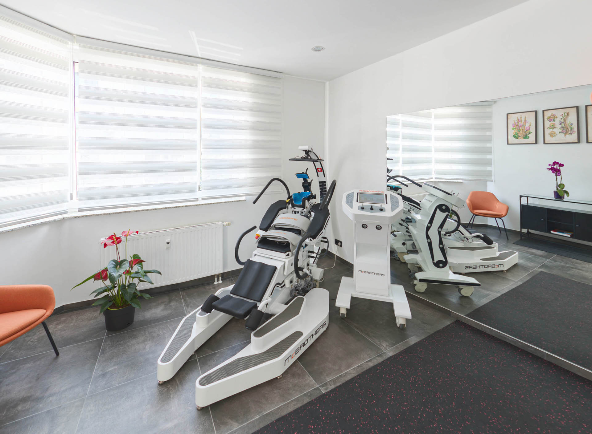 Ein besonderes Highlight ist das RoboSpine-System von McBrothers, das erstmals in Deutschland in unserem Zentrum eingesetzt wird. Diese robotergestützte Therapie verbessert gezielt die Wirbelsäulenmobilisation und wird insbesondere bei Bandscheibenproblemen, Fehlstellungen und chronischen Rückenschmerzen angewendet.